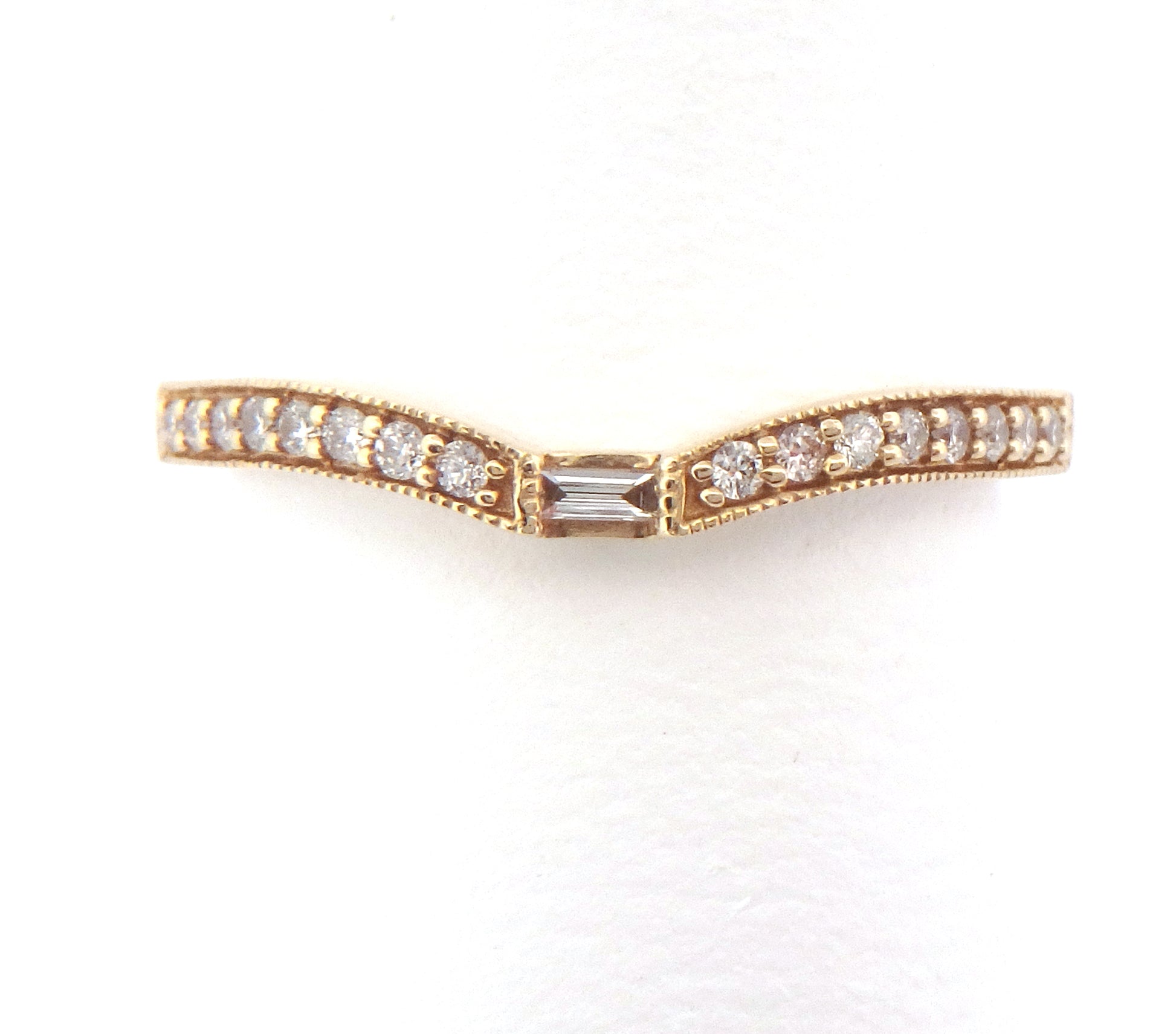 This band seems to magically fit most engagement rings that we try it with. This ring features 1 baguette diamond in the middle that weighs 0.02 carats and 8 full cut round diamonds that have a combined weight of 0.12 carats. Diamonds have SI to VS clarity and H color. Ring is 14 karat yellow gold, is currently a size 7 and weighs 1.8 grams.