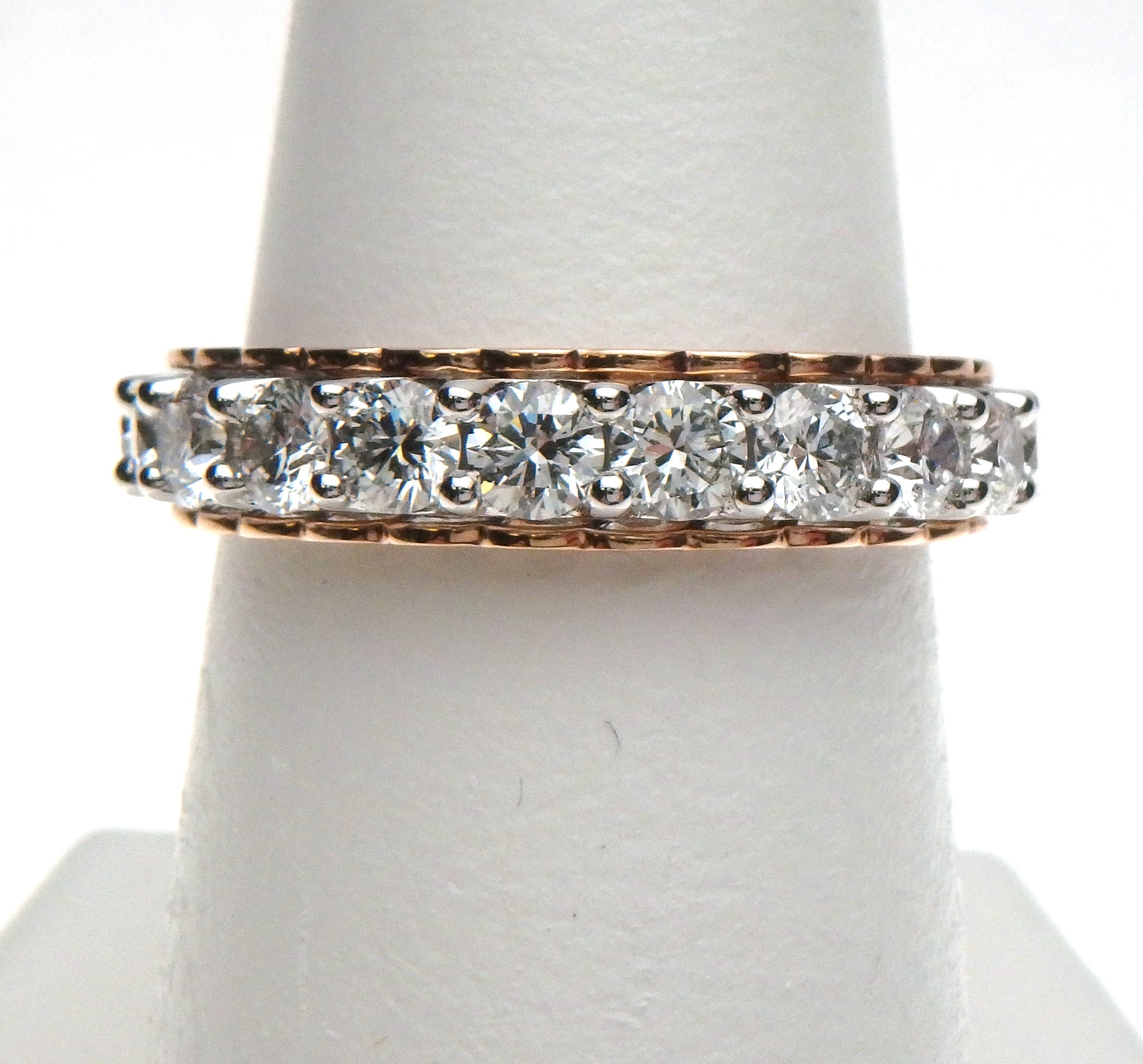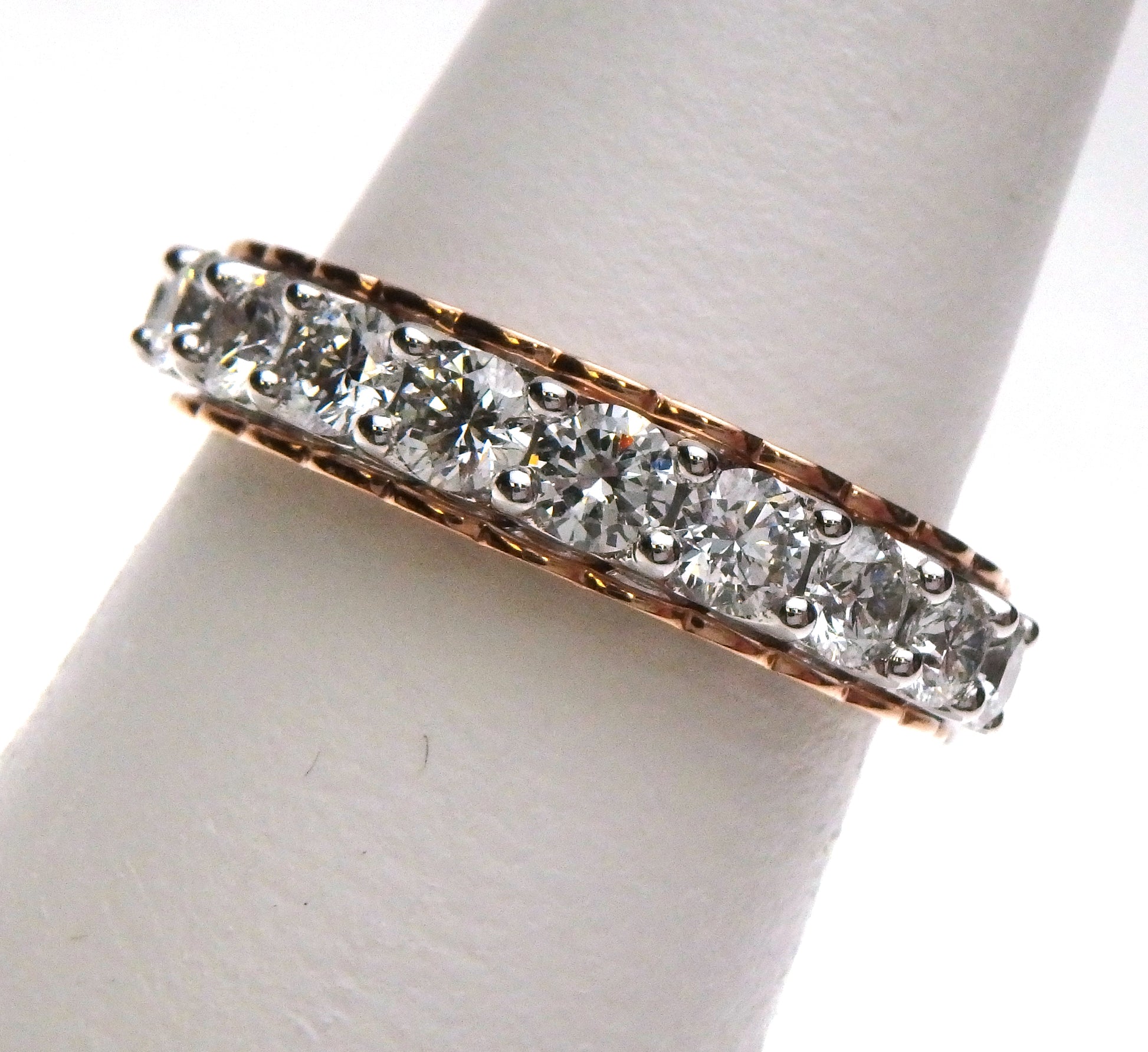 This lovely diamond band features 11 Laboratory Grown diamonds that have a combined weight of 1.03 carats. The diamonds have VS1 clarity and G color. The base of the ring is 14 karat white gold, but there is a rose gold gallery section under the diamonds that makes a scallop shape on the sides when viewed from the top.