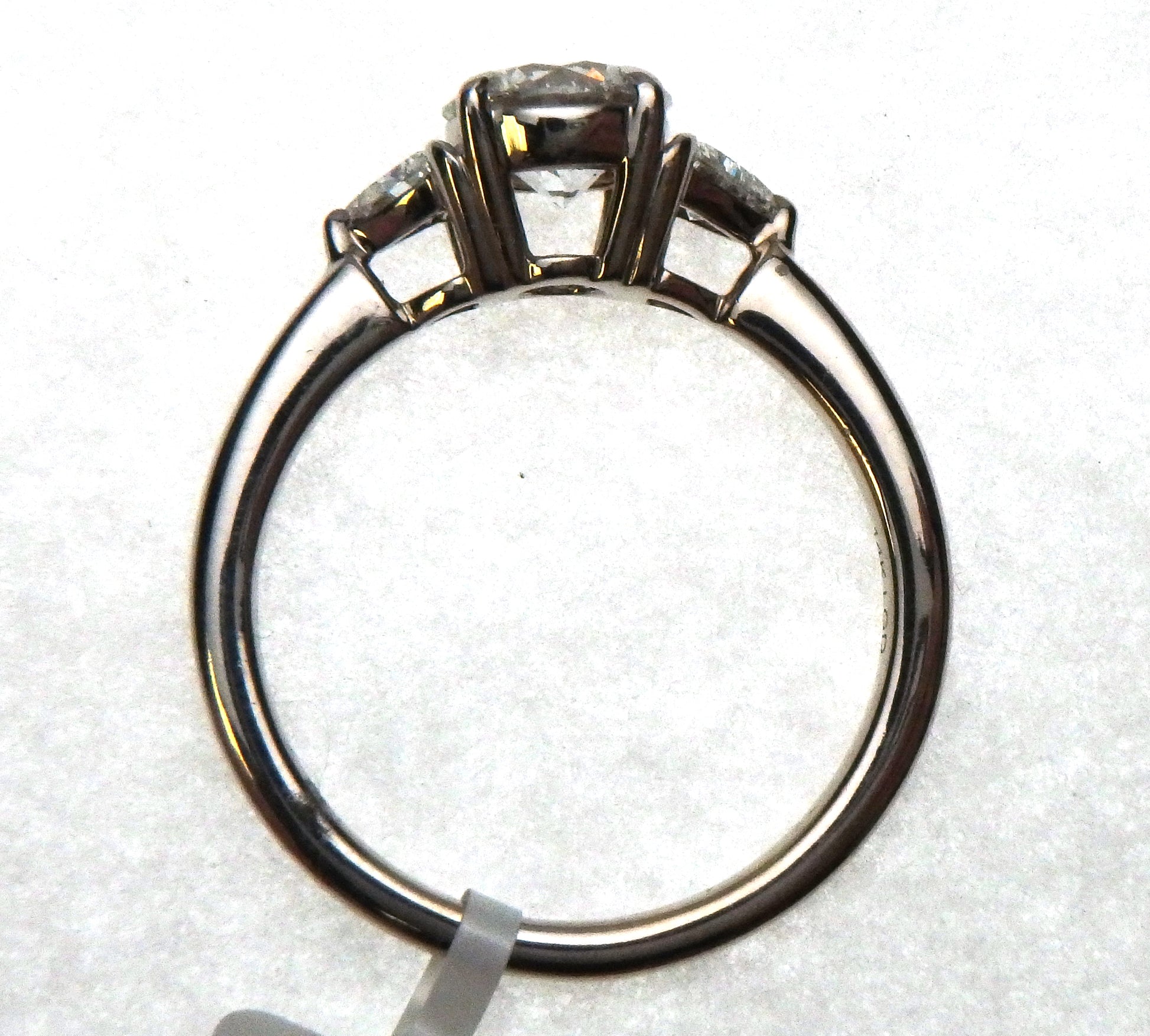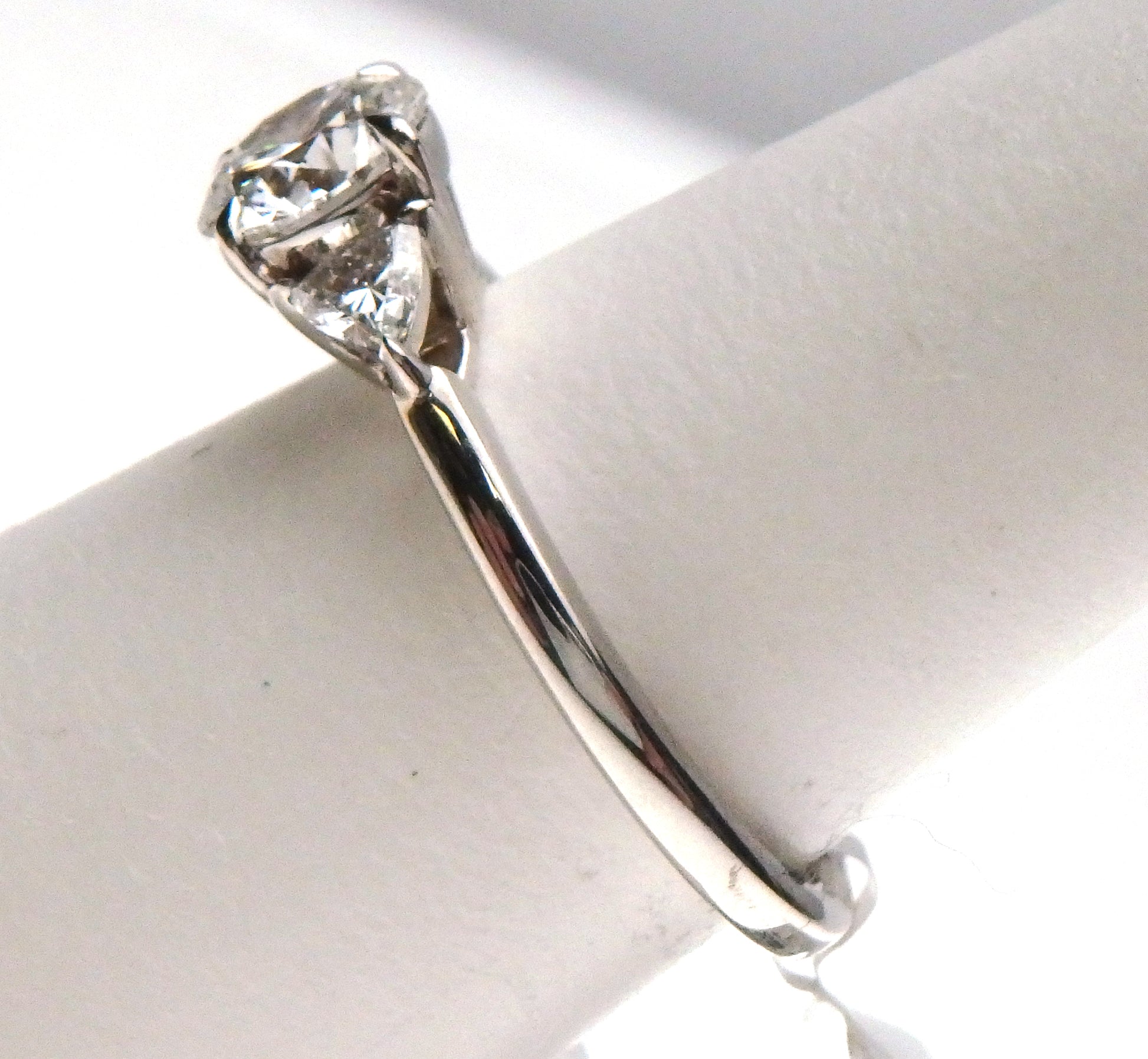 This ring is all laboratory grown diamonds. The center diamond is a standard round brilliant cut that weighs 1.05 carats. The side diamonds are trillion cut and have a combined weight of 0.27 carats. The diamonds all have VS1 clarity and G color. The ring is 14 karat white gold.
