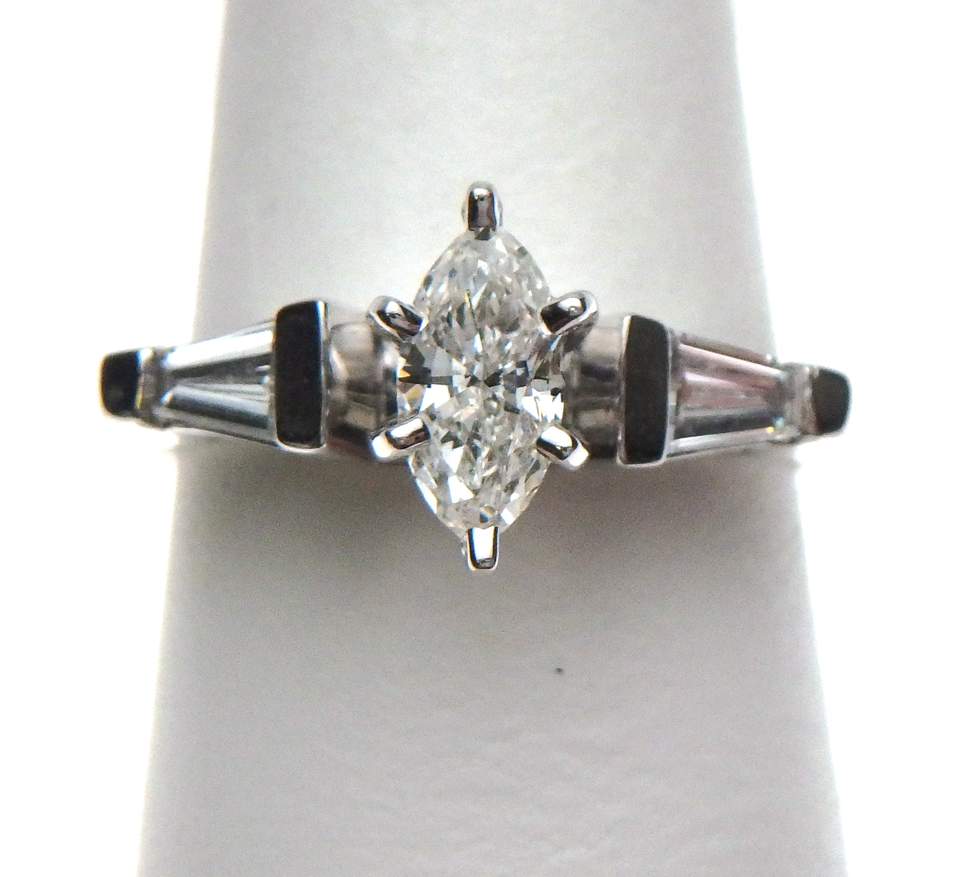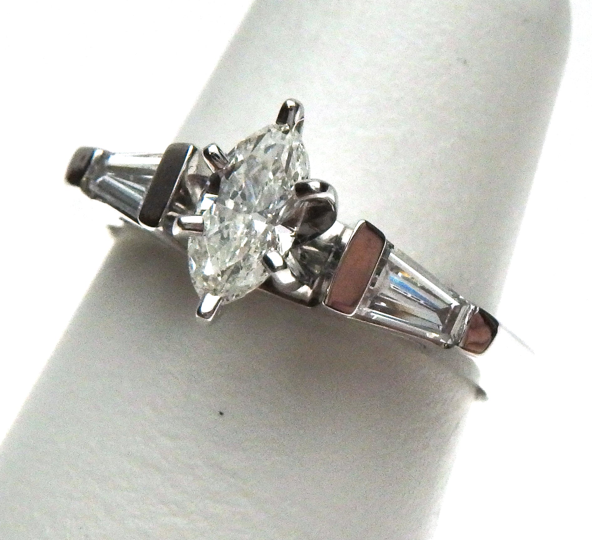 This ring features a marquise cut diamond that weighs 0.38 carats. The marquise diamond has VS1 clarity and G color. The ring also has 2 baguette cut diamonds that have a combined weight of 0.33 carats. The baguette diamonds have VS1 clarity and G color. The ring is 14 karat white gold.