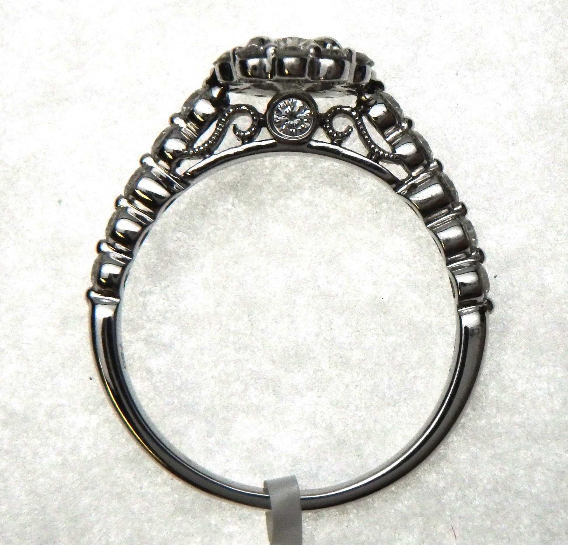 This engagement ring has an oval cut diamond in the center that weight 0.70 carats. The center diamond has SI2 clarity and J color. The ring also has a halo of round diamonds that have a combined weight of 0.64 carats. The side diamonds have VS2 clarity and G-H color. The ring is 18 karat white gold.