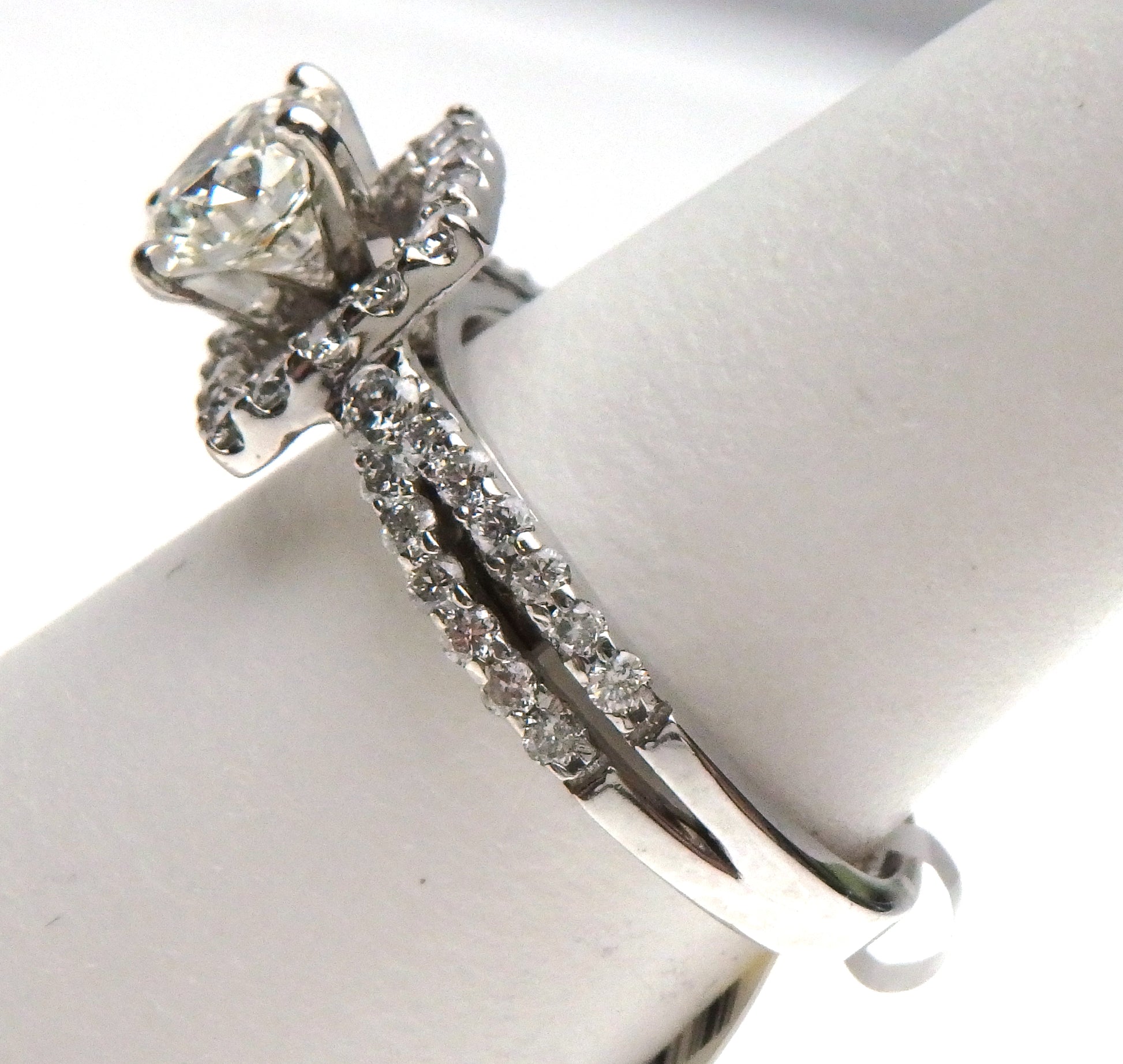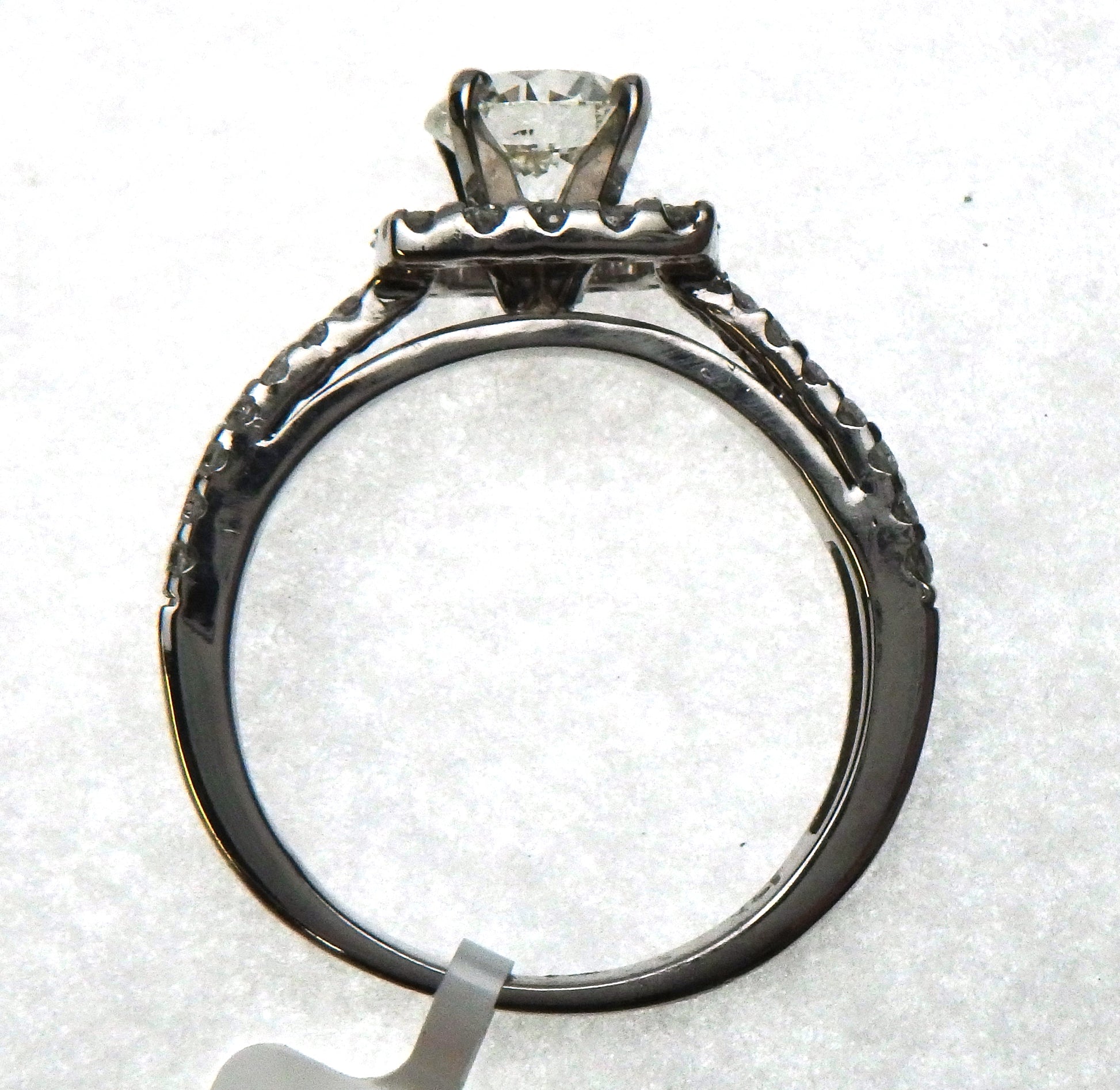 This lovely engagement ring features a standard round brilliant cut diamond in the center that weighs 1.02 carats. The center diamond has S2 clarity and J color. The ring also has a square shaped halo and split sides that have round diamonds with a combined weight of 0.60 carats. The side diamonds have SI1 clarity and H color. The ring is 14 karat white gold.